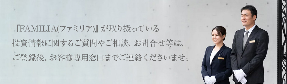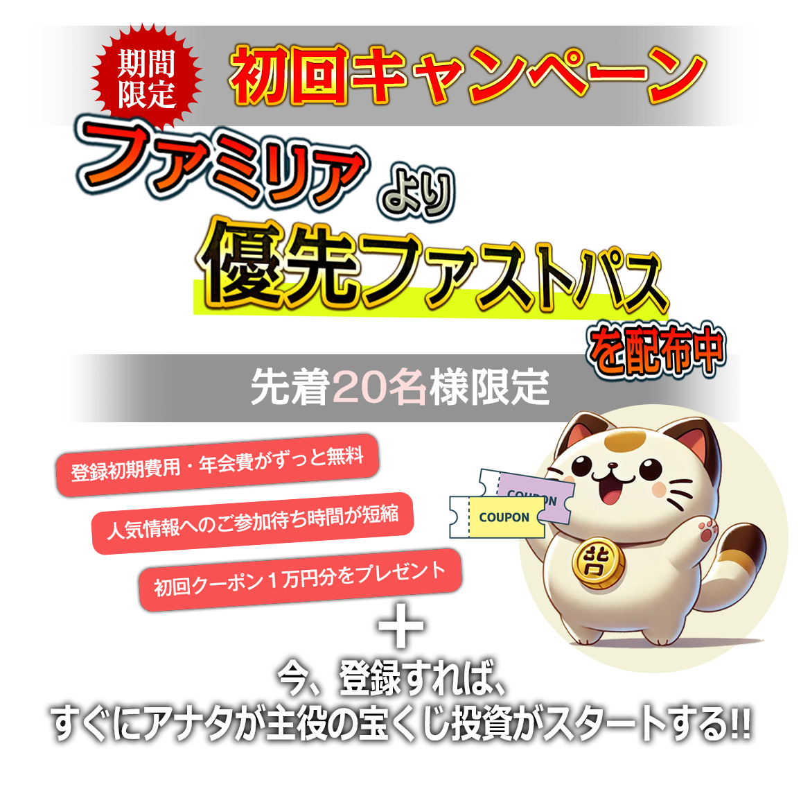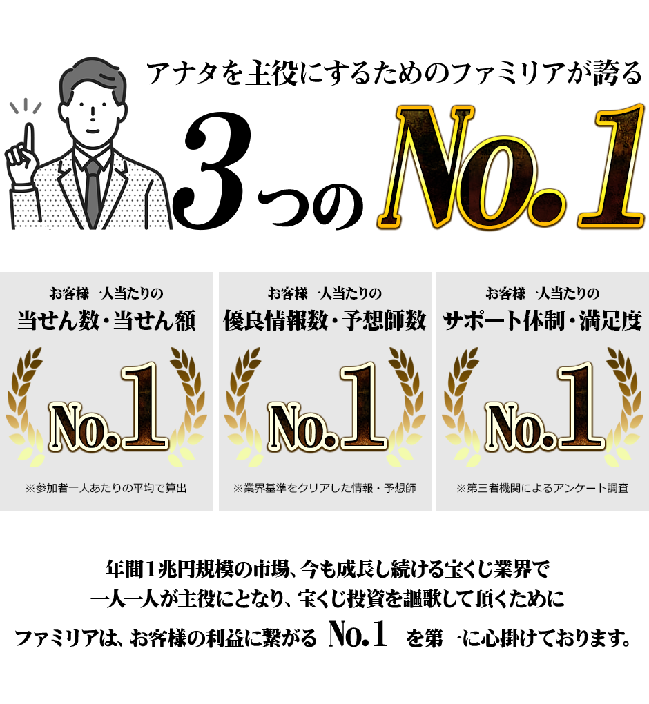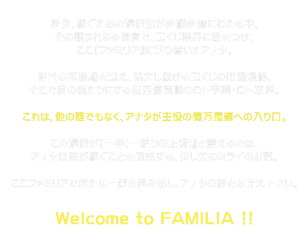 昨今、鋭い嗅覚を持った投資家の間では「宝くじ投資」の注目が高まっておりますが、 誰も教えてくれない、どの投資にも通ずる「勝者のカラクリ」をお伝えします! そ れ は 「大きな(成長し続ける)市場規模」で 「一握りの主役」「自分なりの成功」を掴むことなんです! 小さな(成長のない)規模で、いくらアナタが熱心に投資をしたって稼げませんし、 規模が大きくても、強いライバルに埋もれて、アナタが主役になれなきゃ稼げません。 例 え ば A・市場規模100万円で投資を行い、勝ち組100人に入り1万円を稼ぐ B・市場規模1億円で投資を行い、勝ち組100人に入り100万円を稼ぐ →前提としてここでBを選ばなければ、稼げません。 C・投資家10000人に対して会社実績1億円の場合、投資家の利益は一人当たり1万円 D・投資家100人に対して会社実績1億円の場合、投資家の利益は一人当たり100万円 →同じ実績があったとしても、投資家にとってメリットがあるのはがDなのは明白です。 そして、BとDが揃って初めて「勝者のカラクリ」になるんです! こ れ が ファミリアが、1兆円(大きな)規模の「宝くじ市場」で、 お客様一人当たりの当せん数・当せん額でNo. 1を第一に心がけている理由です。 稼ぎたい理由、稼がなきゃいけない境遇、人それぞれだからこそ、 ファミリアが、お客様一人一人が主役となって稼ぐための終着点となれるよう 成長を止めることはございません。